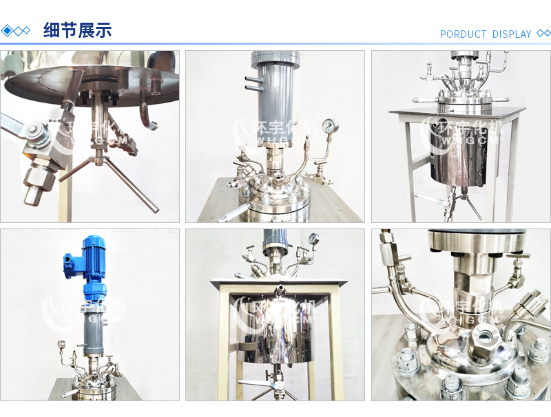 常規(guī)釜蓋開口 氣相口配針形閥,液相口配針形閥及釜內插底管,固體加料口配絲堵,測控溫口配鉑電阻,壓力表安全爆破口配壓力表及安全防爆裝置,釜內冷卻盤管進、出口配水咀
