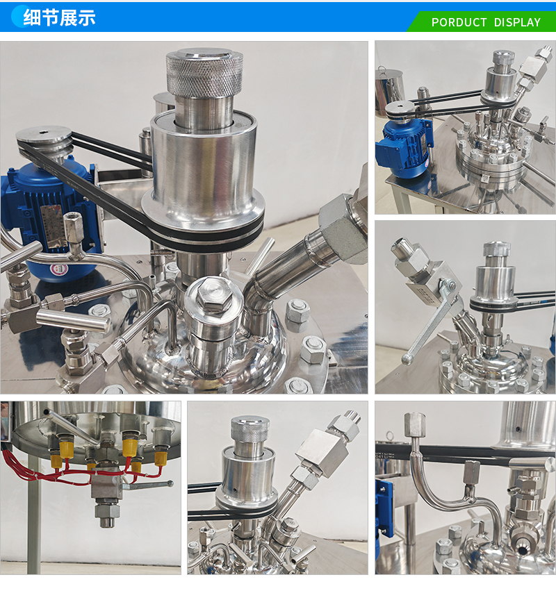 常規(guī)釜蓋開口 氣相口配針形閥,液相口配針形閥及釜內(nèi)插底管,固體加料口配絲堵,測控溫口配鉑電阻,壓力表安全爆破口配壓力表及安全防爆裝置,釜內(nèi)冷卻盤管進(jìn)、出口配水咀
